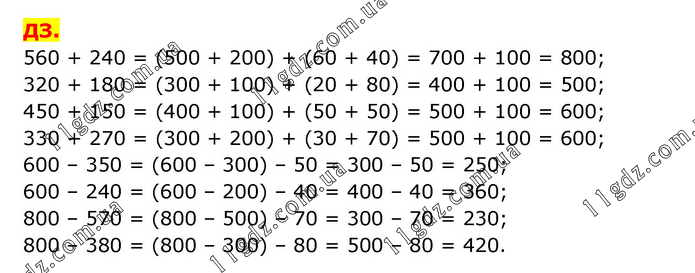 560 + 240 = (500 + 200) + (60 + 40) = 700 + 100 = 800; 320 + 180 = (300 + 100) + (20 + 80) = 400 + 100 = 500; 450 + 150 = (400 + 100) + (50 + 50) = 500 + 100 = 600; 330 + 270 = (300 + 200) + (30 + 70) = 500 + 100 = 600; 600 – 350 = (600 – 300) – 50 = 300 – 50 = 250; 600 – 240 = (600 – 200) – 40 = 400 – 40 = 360; 800 – 570 = (800 – 500) – 70 = 300 – 70 = 230; 800 – 380 = (800 – 300) – 80 = 500 – 80 = 420.