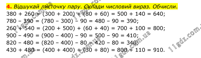 Відшукай листочку пару. Склади числовий вираз. Обчисли. 380 + 260 = (300 + 200) + (80 + 60) = 500 + 140 = 640; 780 – 390 = (780 – 300) – 90 = 480 – 90 = 390; 260 + 540 = (200 + 500) + (60 + 40) = 700 + 100 = 800; 900 – 490 = (900 – 400) – 90 = 500 – 90 = 410; 820 – 480 = (820 – 400) – 80 = 420 – 80 = 340; 430 + 480 = (400 + 400) + (30 + 80) = 800 + 110 = 910.