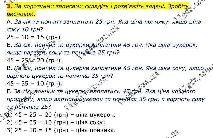 За короткими записами складіть і розв’яжіть задачі. Зробіть висновок. А. За сік та пончик заплатили 25 грн. Яка ціна пончику, якщо ціна соку 10 грн? 25 – 10 = 15 (грн) Б. За сік, пончик та цукерки заплатили 45 грн. Яка ціна цукерок, якщо вартість соку та пончика 25 грн? 45 – 25 = 20 (грн). В. За сік, пончик та цукерки заплатили 45 грн. Яка ціна соку, якщо вартість цукерок та пончика 35 грн? 45 – 35 = 10 (грн). Г. За сік, пончик та цукерки заплатили 45 грн. Яка ціна кожного продукту, якщо вартість цукерок та пончика 35 грн, а вартість соку та пончика 25? 1) 45 – 25 = 20 (грн) – ціна цукерок; 2) 45 – 35 = 10 (грн) – ціна соку; 3) 25 – 10 = 15 (грн) – ціна пончика.