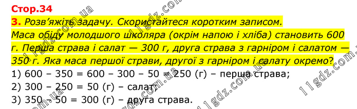 Розв’яжіть задачу. Скористайтеся коротким записом. Маса обіду молодшого школяра (окрім напою і хліба) становить 600 г. Перша страва і салат — 300 г, друга страва з гарніром і салатом — 350 г. Яка маса першої страви, другої з гарніром і салату окремо? 1) 600 – 350 = 600 – 300 – 50 = 250 (г) – перша страва; 2) 300 – 250 = 50 (г) – салат; 3) 350 – 50 = 300 (г) – друга страва.
