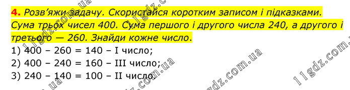 Розв’яжи задачу. Скористайся коротким записом і підказками. Сума трьох чисел 400. Сума першого і другого числа 240, а другого і третього — 260. Знайди кожне число. 1) 400 – 260 = 140 – І число; 2) 400 – 240 = 160 – ІІІ число; 3) 240 – 140 = 100 – ІІ число.