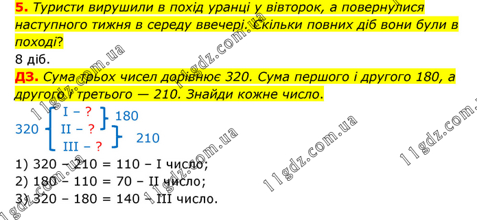Туристи вирушили в похід уранці у вівторок, а повернулися наступного тижня в середу ввечері. Скільки повних діб вони були в поході? 8 діб. ДЗ. Сума трьох чисел дорівнює 320. Сума першого і другого 180, а другого і третього — 210. Знайди кожне число. І – ? 320 ІІ – ? ІІІ – ? 1) 320 – 210 = 110 – І число; 2) 180 – 110 = 70 – ІІ число; 3) 320 – 180 = 140 – ІІІ число.