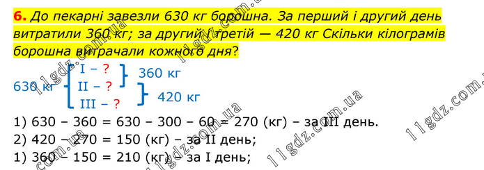 До пекарні завезли 630 кг борошна. За перший і другий день витратили 360 кг; за другий і третій — 420 кг Скільки кілограмів борошна витрачали кожного дня? І – ? 630 кг ІІ – ? ІІІ – ? 1) 630 – 360 = 630 – 300 – 60 = 270 (кг) – за ІІІ день. 2) 420 – 270 = 150 (кг) – за ІІ день; 1) 360 – 150 = 210 (кг) – за І день;