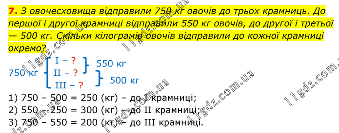 З овочесховища відправили 750 кг овочів до трьох крамниць. До першої і другої крамниці відправили 550 кг овочів, до другої і третьої — 500 кг. Скільки кілограмів овочів відправили до кожної крамниці окремо? І – ? 750 кг ІІ – ? ІІІ – ? 1) 750 – 500 = 250 (кг) – до І крамниці; 2) 550 – 250 = 300 (кг) – до ІІ крамниці; 3) 750 – 550 = 200 (кг) – до ІІІ крамниці.