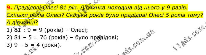 Прадідові Олесі 81 рік. Дівчинка молодша від нього у 9 разів. Скільки років Олесі? Скільки років було прадідові Олесі 5 років тому? А дівчинці? 1) 81 : 9 = 9 (років) – Олесі; 2) 81 – 5 = 76 (років) – було прадідові; 3) 9 – 5 = 4 (роки).