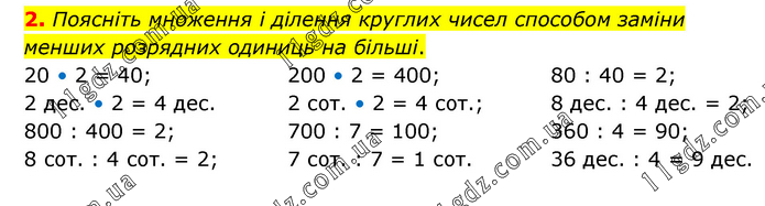 Поясніть множення і ділення круглих чисел способом заміни менших розрядних одиниць на більші. 20 • 2 = 40; 2 дес. • 2 = 4 дес. 800 : 400 = 2; 8 сот. : 4 сот. = 2; 200 • 2 = 400; 2 сот. • 2 = 4 сот.; 700 : 7 = 100; 7 сот. : 7 = 1 сот. 80 : 40 = 2; 8 дес. : 4 дес. = 2; 360 : 4 = 90; 36 дес. : 4 = 9 дес.