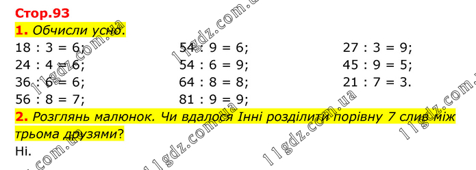 1. Обчисли усно. 18 : 3 = 6; 24 : 4 = 6; 36 : 6 = 6; 56 : 8 = 7; 54 : 9 = 6; 54 : 6 = 9; 64 : 8 = 8; 81 : 9 = 9; 27 : 3 = 9; 45 : 9 = 5; 21 : 7 = 3. 2. Розглянь малюнок. Чи вдалося Інні розділити порівну 7 слив між трьома друзями? Ні.
