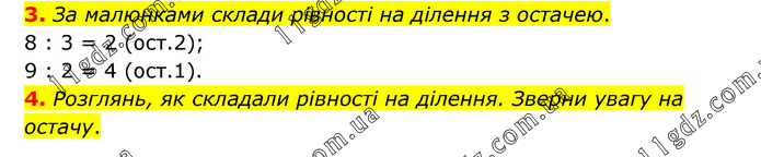 3. За малюнками склади рівності на ділення з остачею. 8 : 3 = 2 (ост.2); 9 : 2 = 4 (ост.1). 4. Розглянь, як складали рівності на ділення. Зверни увагу на остачу.