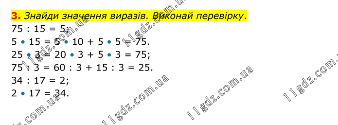 Знайди значення виразів. Виконай перевірку. 75 : 15 = 5; 5 • 15 = 5 • 10 + 5 • 5 = 75. 25 • 3 = 20 • 3 + 5 • 3 = 75; 75 : 3 = 60 : 3 + 15 : 3 = 25. 34 : 17 = 2; 2 • 17 = 34.