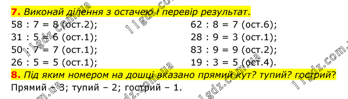 7. Виконай ділення з остачею і перевір результат. 58 : 7 = 8 (ост.2); 31 : 5 = 6 (ост.1); 50 : 7 = 7 (ост.1); 26 : 5 = 5 (ост.1); 62 : 8 = 7 (ост.6); 28 : 9 = 3 (ост.1); 83 : 9 = 9 (ост.2); 19 : 3 = 5 (ост.4). 8. Під яким номером на дошці вказано прямий кут? тупий? гострий? Прямий – 3; тупий – 2; гострий – 1.