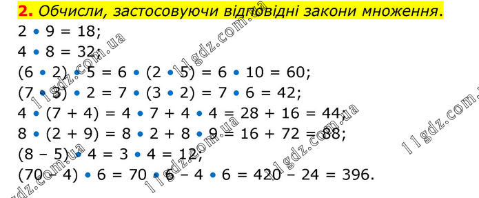 Обчисли, застосовуючи відповідні закони множення. 2 • 9 = 18; 4 • 8 = 32; (6 • 2) • 5 = 6 • (2 • 5) = 6 • 10 = 60; (7 • 3) • 2 = 7 • (3 • 2) = 7 • 6 = 42; 4 • (7 + 4) = 4 • 7 + 4 • 4 = 28 + 16 = 44; 8 • (2 + 9) = 8 • 2 + 8 • 9 = 16 + 72 = 88; (8 – 5) • 4 = 3 • 4 = 12; (70 – 4) • 6 = 70 • 6 – 4 • 6 = 420 – 24 = 396.