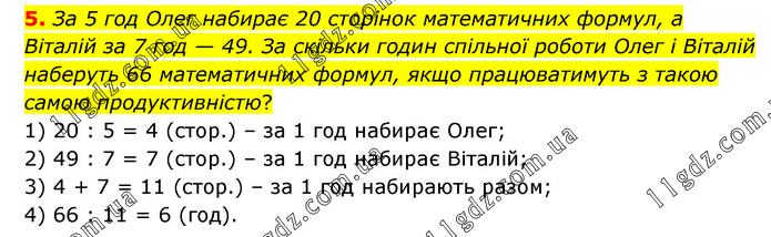 За 5 год Олег набирає 20 сторінок математичних формул, а Віталій за 7 год — 49. За скільки годин спільної роботи Олег і Віталій наберуть 66 математичних формул, якщо працюватимуть з такою самою продуктивністю? 1) 20 : 5 = 4 (стор.) – за 1 год набирає Олег; 2) 49 : 7 = 7 (стор.) – за 1 год набирає Віталій; 3) 4 + 7 = 11 (стор.) – за 1 год набирають разом; 4) 66 : 11 = 6 (год).