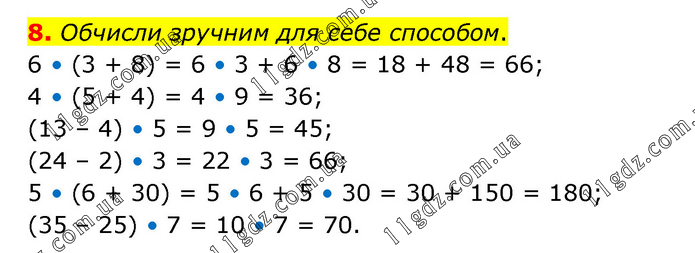 Обчисли зручним для себе способом. 6 • (3 + 8) = 6 • 3 + 6 • 8 = 18 + 48 = 66; 4 • (5 + 4) = 4 • 9 = 36; (13 – 4) • 5 = 9 • 5 = 45; (24 – 2) • 3 = 22 • 3 = 66; 5 • (6 + 30) = 5 • 6 + 5 • 30 = 30 + 150 = 180; (35 – 25) • 7 = 10 • 7 = 70.
