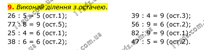 Виконай ділення з остачею. 26 : 5 = 5 (ост.1); 77 : 8 = 9 (ост.5); 25 : 4 = 6 (ост.1); 38 : 6 = 6 (ост.2); 39 : 4 = 9 (ост.3); 56 : 9 = 6 (ост.2); 82 : 9 = 9 (ост.1): 47 : 5 = 9 (ост.2).