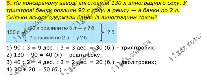 На консервному заводі виготовили 130 л виноградного соку. У трилітрові банки розлили 90 л соку, а решту — в банки по 2 л. Скільки всього одержали банок із виноградним соком? 1) 90 : 3 = 9 дес. : 3 = 3 дес. = 30 (б.) – трилітрових; 2) 130 – 90 = 40 (л) – решта соку; 3) 40 : 2 = 4 дес. : 2 = 2 дес. = 20 (б.) – дволітрових; 4) 30 + 20 = 50 (б.)