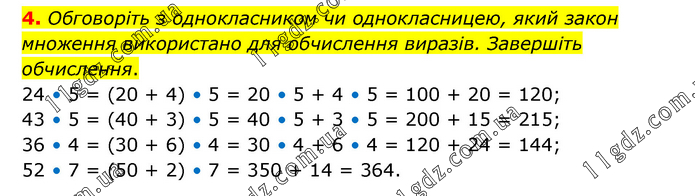 Обговоріть з однокласником чи однокласницею, який закон множення використано для обчислення виразів. Завершіть обчислення. 24 • 5 = (20 + 4) • 5 = 20 • 5 + 4 • 5 = 100 + 20 = 120; 43 • 5 = (40 + 3) • 5 = 40 • 5 + 3 • 5 = 200 + 15 = 215; 36 • 4 = (30 + 6) • 4 = 30 • 4 + 6 • 4 = 120 + 24 = 144; 52 • 7 = (50 + 2) • 7 = 350 + 14 = 364.