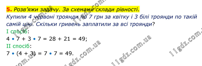 Розв’яжи задачу. За схемами склади рівності. Купили 4 червоні троянди по 7 грн за квітку і 3 білі троянди по такій самій ціні. Скільки гривень заплатили за всі троянди? І спосіб: 4 • 7 + 3 • 7 = 28 + 21 = 49; ІІ спосіб: 7 • (4 + 3) = 7 • 7 = 49.