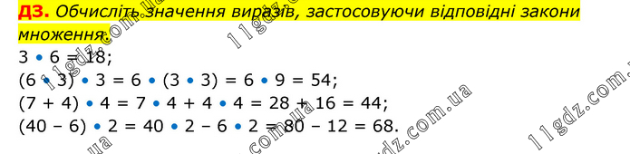 Обчисліть значення виразів, застосовуючи відповідні закони множення. 3 • 6 = 18; (6 • 3) • 3 = 6 • (3 • 3) = 6 • 9 = 54; (7 + 4) • 4 = 7 • 4 + 4 • 4 = 28 + 16 = 44; (40 – 6) • 2 = 40 • 2 – 6 • 2 = 80 – 12 = 68.