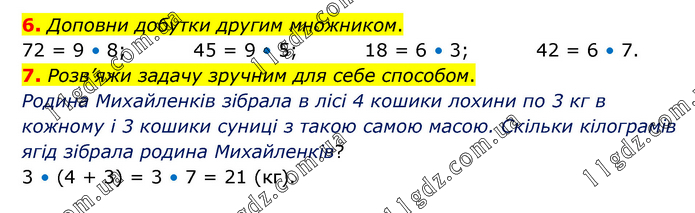 6. Доповни добутки другим множником. 72 = 9 • 8; 45 = 9 • 5; 18 = 6 • 3; 42 = 6 • 7. 7. Розв’яжи задачу зручним для себе способом. Родина Михайленків зібрала в лісі 4 кошики лохини по 3 кг в кожному і 3 кошики суниці з такою самою масою. Скільки кілограмів ягід зібрала родина Михайленків? 3 • (4 + 3) = 3 • 7 = 21 (кг).