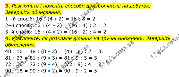 3. Розгляньте і поясніть способи ділення числа на добуток. Завершіть обчислення. 1 –й спосіб: 16 : (4 • 2) = 16 : 8 = 2. 2–й спосіб: 16 : (4 • 2) = (16 : 4) : 2 = 2. 3–й спосіб: 16 : (4 • 2) = (16 : 2) : 4 = 2. 4. Розгляньте, як розклали дільник на зручні множники. Завершіть обчислення. 48 : 16 = 48 : (8 • 2) = (48 : 8) : 2 = 3. 81 : 27 = 81 : (9 • 3) = 81 : 9 : 3 = 3. 72 : 36 = 72 : (9 • 4) = (72 : 9) : 4 = 2. 90 : 18 = 90 : (9 • 2) = 90 : 9 : 2 = 5.