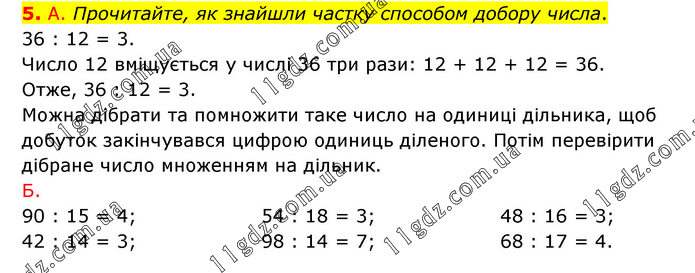 А. Прочитайте, як знайшли частку способом добору числа. 36 : 12 = 3. Число 12 вміщується у числі 36 три рази: 12 + 12 + 12 = 36. Отже, 36 : 12 = 3. Можна дібрати та помножити таке число на одиниці дільника, щоб добуток закінчувався цифрою одиниць діленого. Потім перевірити дібране число множенням на дільник. Б. 90 : 15 = 4; 42 : 14 = 3; 54 : 18 = 3; 98 : 14 = 7; 48 : 16 = 3; 68 : 17 = 4.