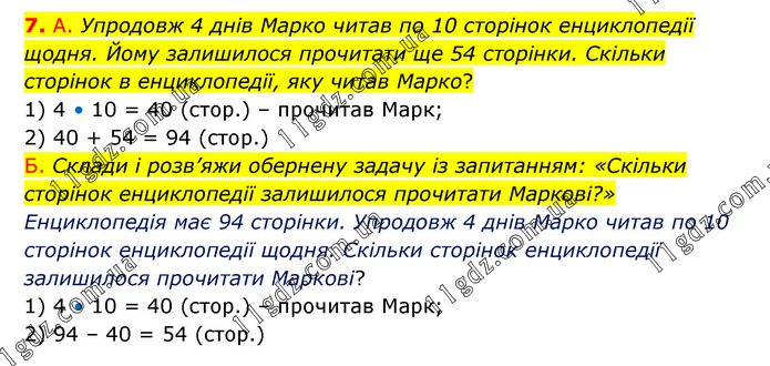 А. Упродовж 4 днів Марко читав по 10 сторінок енциклопедії щодня. Йому залишилося прочитати ще 54 сторінки. Скільки сторінок в енциклопедії, яку читав Марко? 1) 4 • 10 = 40 (стор.) – прочитав Марк; 2) 40 + 54 = 94 (стор.) Б. Склади і розв’яжи обернену задачу із запитанням: «Скільки сторінок енциклопедії залишилося прочитати Маркові?» Енциклопедія має 94 сторінки. Упродовж 4 днів Марко читав по 10 сторінок енциклопедії щодня. Скільки сторінок енциклопедії залишилося прочитати Маркові? 1) 4 • 10 = 40 (стор.) – прочитав Марк; 2) 94 – 40 = 54 (стор.)