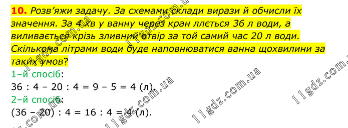 Розв’яжи задачу. За схемами склади вирази й обчисли їх значення. За 4 хв у ванну через кран ллється 36 л води, а виливається крізь зливний отвір за той самий час 20 л води. Скількома літрами води буде наповнюватися ванна щохвилини за таких умов? 1–й спосіб: 36 : 4 – 20 : 4 = 9 – 5 = 4 (л). 2–й спосіб: (36 – 20) : 4 = 16 : 4 = 4 (л).