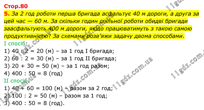 За 2 год роботи перша бригада асфальтує 40 м дороги, а друга за цей час — 60 м. За скільки годин спільної роботи обидві бригади заасфальтують 400 м дороги, якщо працюватимуть з такою самою продуктивністю? За схемами розв’яжи задачу двома способами. І спосіб: 1) 40 : 2 = 20 (м) – за 1 год І бригада; 2) 60 : 2 = 30 (м) – за 1 год ІІ бригада; 3) 20 + 30 = 50 (м) – за 1 год разом; 4) 400 : 50 = 8 (год) ІІ спосіб: 1) 40 + 60 = 100 (м) – разом за 2 год; 2) 100 : 2 = 50 (м) – разом за 1 год; 3) 400 : 50 = 8 (год).