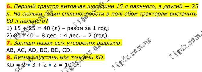 6. Перший трактор витрачає щогодини 15 л пального, а другий — 25 л. На скільки годин спільної роботи в полі обом тракторам вистачить 80 л пального? 1) 15 + 25 = 40 (л) – разом за 1 год; 2) 80 : 40 = 8 дес. : 4 дес. = 2 (год). 7. Запиши назви всіх утворених відрізків. АВ, АС, АD, BC, BD, CD. 8. Визнач відстань між точками KD. KD = 2 • 3 + 2 • 2 = 10 см.