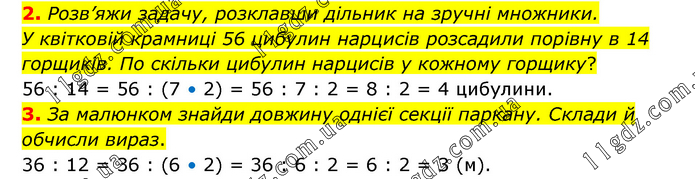 2. Розв’яжи задачу, розклавши дільник на зручні множники. У квітковій крамниці 56 цибулин нарцисів розсадили порівну в 14 горщиків. По скільки цибулин нарцисів у кожному горщику? 56 : 14 = 56 : (7 • 2) = 56 : 7 : 2 = 8 : 2 = 4 цибулини. 3. За малюнком знайди довжину однієї секції паркану. Склади й обчисли вираз. 36 : 12 = 36 : (6 • 2) = 36 : 6 : 2 = 6 : 2 = 3 (м).
