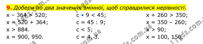 Добери по два значення змінної, щоб справдилися нерівності. х – 364 > 520; х = 520 + 364; х > 884. x = 900, 950. с • 9 < 45; c = 45 : 9; c < 5; c = 4, 3. х + 260 > 350; x = 350 – 260; x > 90; x = 100, 150.