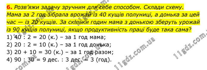 Розв’яжи задачу зручним для себе способом. Склади схему. Мама за 2 год зібрала врожай із 40 кущів полуниці, а донька за цей час — із 20 кущів. За скільки годин мама з донькою зберуть урожай із 90 кущів полуниці, якщо продуктивність праці буде така сама? 1) 40 : 2 = 20 (к.) – за 1 год мама; 2) 20 : 2 = 10 (к.) – за 1 год донька; 3) 20 + 10 = 30 (к.) – за 1 год разом; 4) 90 : 30 = 9 дес. : 3 дес. = 3 (год).