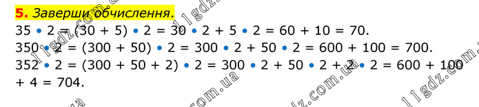 Заверши обчислення. 35 • 2 = (30 + 5) • 2 = 30 • 2 + 5 • 2 = 60 + 10 = 70. 350 • 2 = (300 + 50) • 2 = 300 • 2 + 50 • 2 = 600 + 100 = 700. 352 • 2 = (300 + 50 + 2) • 2 = 300 • 2 + 50 • 2 + 2 • 2 = 600 + 100 + 4 = 704.