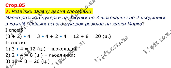 Розв’яжи задачу двома способами. Марко розклав цукерки на 4 купки по 3 шоколадні і по 2 льодяники в кожній. Скільки всього цукерок розклав на купки Марко? І спосіб: (3 + 2) • 4 = 3 • 4 + 2 • 4 = 12 + 8 = 20 (ц.) ІІ спосіб: 1) 3 • 4 = 12 (ц.) – шоколадні; 2) 2 • 4 = 8 (ц.) – льодяники; 3) 12 + 8 = 20 (ц.)