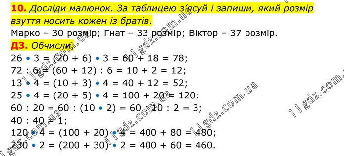 Досліди малюнок. За таблицею з’ясуй і запиши, який розмір взуття носить кожен із братів. Марко – 30 розмір; Гнат – 33 розмір; Віктор – 37 розмір. ДЗ. Обчисли. 26 • 3 = (20 + 6) • 3 = 60 + 18 = 78; 72 : 6 = (60 + 12) : 6 = 10 + 2 = 12; 13 • 4 = (10 + 3) • 4 = 40 + 12 = 52; 25 • 4 = (20 + 5) • 4 = 100 + 20 = 120; 60 : 20 = 60 : (10 • 2) = 60 : 10 : 2 = 3; 40 : 40 = 1; 120 • 4 = (100 + 20) • 4 = 400 + 80 = 480; 230 • 2 = (200 + 30) • 2 = 400 + 60 = 460.