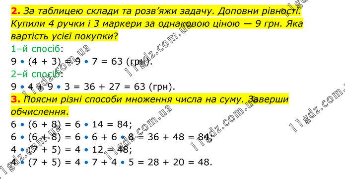 2. За таблицею склади та розв’яжи задачу. Доповни рівності. Купили 4 ручки і 3 маркери за однаковою ціною — 9 грн. Яка вартість усієї покупки? 1–й спосіб: 9 • (4 + 3) = 9 • 7 = 63 (грн). 2–й спосіб: 9 • 4 + 9 • 3 = 36 + 27 = 63 (грн). 3. Поясни різні способи множення числа на суму. Заверши обчислення. 6 • (6 + 8) = 6 • 14 = 84; 6 • (6 + 8) = 6 • 6 + 6 • 8 = 36 + 48 = 84; 4 • (7 + 5) = 4 • 12 = 48; 4 • (7 + 5) = 4 • 7 + 4 • 5 = 28 + 20 = 48.