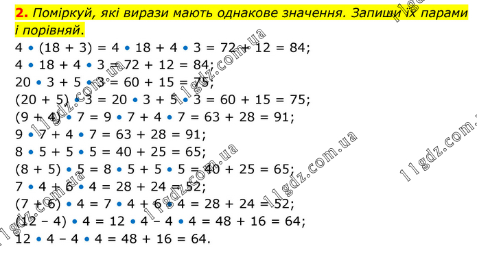 Поміркуй, які вирази мають однакове значення. Запиши їх парами і порівняй. 4 • (18 + 3) = 4 • 18 + 4 • 3 = 72 + 12 = 84; 4 • 18 + 4 • 3 = 72 + 12 = 84; 20 • 3 + 5 • 3 = 60 + 15 = 75; (20 + 5) • 3 = 20 • 3 + 5 • 3 = 60 + 15 = 75; (9 + 4) • 7 = 9 • 7 + 4 • 7 = 63 + 28 = 91; 9 • 7 + 4 • 7 = 63 + 28 = 91; 8 • 5 + 5 • 5 = 40 + 25 = 65; (8 + 5) • 5 = 8 • 5 + 5 • 5 = 40 + 25 = 65; 7 • 4 + 6 • 4 = 28 + 24 = 52; (7 + 6) • 4 = 7 • 4 + 6 • 4 = 28 + 24 = 52; (12 – 4) • 4 = 12 • 4 – 4 • 4 = 48 + 16 = 64; 12 • 4 – 4 • 4 = 48 + 16 = 64.