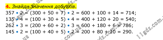 Знайди значення добутків. 357 • 2 = (300 + 50 + 7) • 2 = 600 + 100 + 14 = 714; 135 • 4 = (100 + 30 + 5) • 4 = 400 + 120 + 20 = 540; 262 • 3 = (200 + 60 + 2) • 3 = 600 + 180 + 6 = 786; 145 • 2 = (100 + 40 + 5) • 2 = 200 + 80 + 10 = 290.