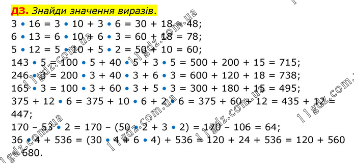 Знайди значення виразів. 3 • 16 = 3 • 10 + 3 • 6 = 30 + 18 = 48; 6 • 13 = 6 • 10 + 6 • 3 = 60 + 18 = 78; 5 • 12 = 5 • 10 + 5 • 2 = 50 + 10 = 60; 143 • 5 = 100 • 5 + 40 • 5 + 3 • 5 = 500 + 200 + 15 = 715; 246 • 3 = 200 • 3 + 40 • 3 + 6 • 3 = 600 + 120 + 18 = 738; 165 • 3 = 100 • 3 + 60 • 3 + 5 • 3 = 300 + 180 + 15 = 495; 375 + 12 • 6 = 375 + 10 • 6 + 2 • 6 = 375 + 60 + 12 = 435 + 12 = 447; 170 – 53 • 2 = 170 – (50 • 2 + 3 • 2) = 170 – 106 = 64; 36 • 4 + 536 = (30 • 4 + 6 • 4) + 536 = 120 + 24 + 536 = 120 + 560 = 680.