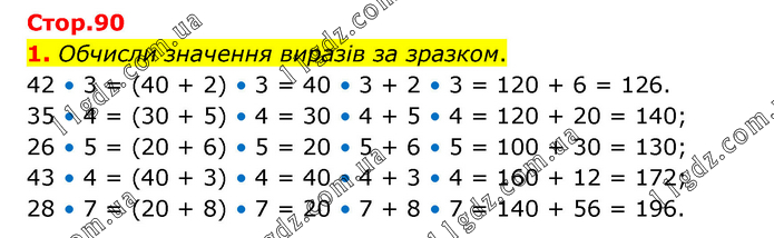 Обчисли значення виразів за зразком. 42 • 3 = (40 + 2) • 3 = 40 • 3 + 2 • 3 = 120 + 6 = 126. 35 • 4 = (30 + 5) • 4 = 30 • 4 + 5 • 4 = 120 + 20 = 140; 26 • 5 = (20 + 6) • 5 = 20 • 5 + 6 • 5 = 100 + 30 = 130; 43 • 4 = (40 + 3) • 4 = 40 • 4 + 3 • 4 = 160 + 12 = 172; 28 • 7 = (20 + 8) • 7 = 20 • 7 + 8 • 7 = 140 + 56 = 196.