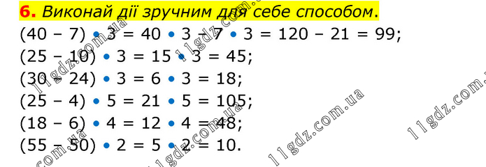 Виконай дії зручним для себе способом. (40 – 7) • 3 = 40 • 3 – 7 • 3 = 120 – 21 = 99; (25 – 10) • 3 = 15 • 3 = 45; (30 – 24) • 3 = 6 • 3 = 18; (25 – 4) • 5 = 21 • 5 = 105; (18 – 6) • 4 = 12 • 4 = 48; (55 – 50) • 2 = 5 • 2 = 10.