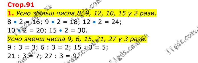 Усно збільш числа 8, 9, 12, 10, 15 у 2 рази. 8 • 2 = 16; 9 • 2 = 18; 12 • 2 = 24; 10 • 2 = 20; 15 • 2 = 30. Усно зменш числа 9, 6, 15, 21, 27 у 3 рази. 9 : 3 = 3; 6 : 3 = 2; 15 : 3 = 5; 21 : 3 = 7; 27 : 3 = 9.