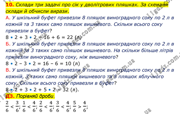 10. Склади три задачі про сік у дволітрових пляшках. За схемами склади й обчисли вирази. А. У шкільний буфет привезли 8 пляшок виноградного соку по 2 л в кожній та 3 таких само пляшок вишневого. Скільки всього соку привезли в буфет? 8 • 2 + 3 • 2 = 16 + 6 = 22 (л) Б. У шкільний буфет привезли 8 пляшок виноградного соку по 2 л в кожній та 3 таких само пляшок вишневого. На скільки більше літрів привезли виноградного соку, ніж вишневого? 8 • 2 – 3 • 2 = 16 – 6 = 10 (л) В. У шкільний буфет привезли 8 пляшок виноградного соку по 2 л в кожній, 3 таких само пляшок вишневого та 5 пляшок яблучного соку. Скільки всього соку привезли в буфет? 8 • 2 + 3 • 2 + 5 • 2 = 32 (л). ДЗ. Порівняй дроби. 2/6 < 3/6; 1/6 < 4/6; 2/6 < 4/6; 3/6 < 4/6; 5/6 > 4/6;