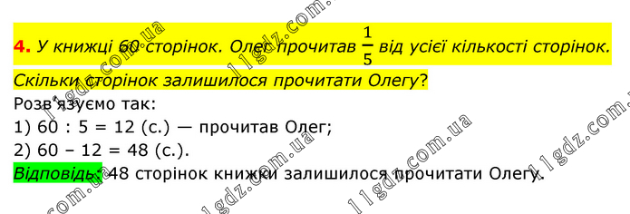 У книжці 60 сторінок. Олег прочитав 1/5 від усієї кількості сторінок. Скільки сторінок залишилося прочитати Олегу? Розв’язуємо так: 1) 60 : 5 = 12 (с.) — прочитав Олег; 2) 60 – 12 = 48 (с.). Відповідь: 48 сторінок книжки залишилося прочитати Олегу.