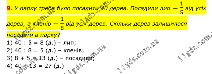У парку треба було посадити 40 дерев. Посадили лип — 1/5 від усіх дерев, а кленів — 1/8 від усіх дерев. Скільки дерев залишилося посадити в парку? 1) 40 : 5 = 8 (д.) – лип; 2) 40 : 8 = 5 (д.) – кленів; 3) 8 + 5 = 13 (д.) – посадили; 4) 40 – 13 = 27 (д.)