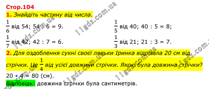 1. Знайдіть частину від числа. 1/6 від 54; 54 : 6 = 9. 1/7 від 42; 42 : 7 = 6. 1/5 від 40; 40 : 5 = 8; 1/3 від 21; 21 : 3 = 7. 2. Для оздоблення сукні своєї ляльки Іринка відрізала 20 см від стрічки. Це 1/4 від усієї довжини стрічки. Якою була довжина стрічки? 20 • 4 = 80 (см). Відповідь: довжина стрічки була сантиметрів.