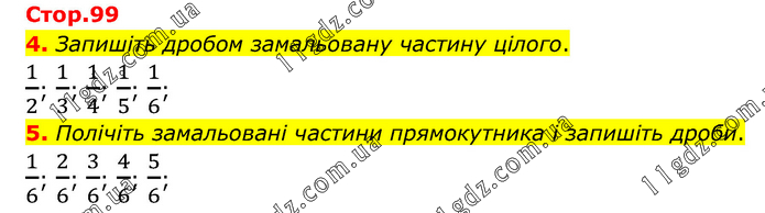 4. Запишіть дробом замальовану частину цілого. 1/2; 1/3; 1/4; 1/5; 1/6; 5. Полічіть замальовані частини прямокутника і запишіть дроби. 1/6; 2/6; 3/6; 4/6; 5/6;