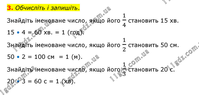 Обчисліть і запишіть. Знайдіть іменоване число, якщо його 1/4 становить 15 хв. 15 • 4 = 60 хв. = 1 (год). Знайдіть іменоване число, якщо його 1/2 становить 50 см. 50 • 2 = 100 см = 1 (м). Знайдіть іменоване число, якщо його 1/3 становить 20 с. 20 • 3 = 60 с = 1 (хв).