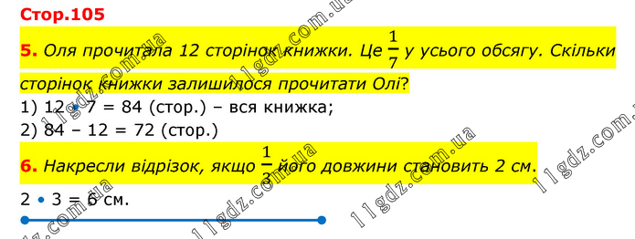 5. Оля прочитала 12 сторінок книжки. Це 1/7 у усього обсягу. Скільки сторінок книжки залишилося прочитати Олі? 1) 12 • 7 = 84 (стор.) – вся книжка; 2) 84 – 12 = 72 (стор.) 6. Накресли відрізок, якщо 1/3 його довжини становить 2 см. 2 • 3 = 6 см.