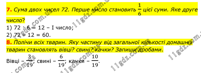 7. Сума двох чисел 72. Перше число становить 1/6 цієї суми. Яке друге число? 1) 72 : 6 = 12 – І число; 2) 72 – 12 = 60. 8. Полічи всіх тварин. Яку частину від загальної кількості домашніх тварин становлять вівці? свині? качки? Запиши дробами. Вівці – 3/19; свині – 6/19; качки – 10/19.